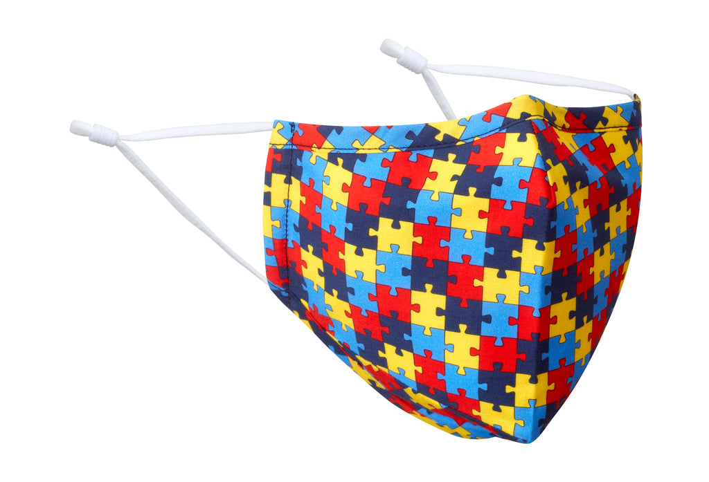 Interlocking puzzle pieces of blue, yellow, navy and red all come together on this fun cotton face mask.