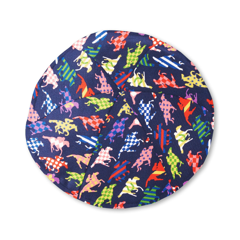 Silhouettes of jockies on their mounts - each featuring a different racing silk pattern - dash toward an unseen finish line in this delightful design on navy blue silk twill.