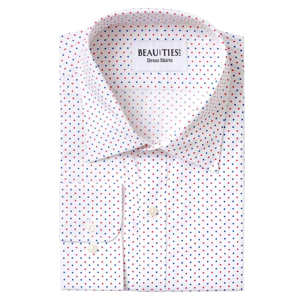 Red and Blue dotscreate an engaging pattern on this 100% 2-ply 80 count white cotton dress shirt. When solids and checks don't do the trick, this shirt will give you the style you crave at a price you'll love.