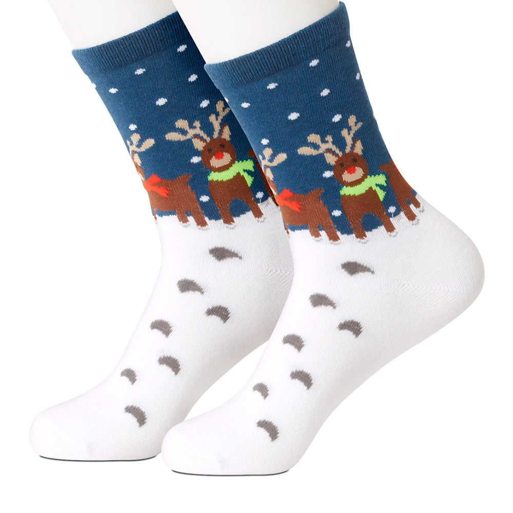 It's easy to track this cheerful little herd of reindeer - each in a snuggly red or green scarf, standing in new snow on a frosty evening.