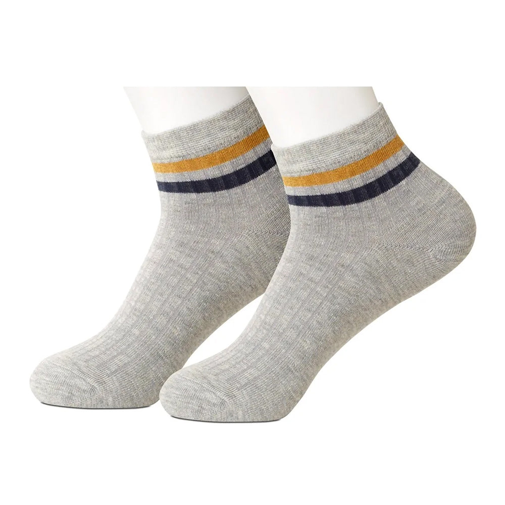 Subtle ribbing in a warm shade of grey, with a navy and gold striped duet to top it off, adds interest and texture to these appealing ankle socks.
