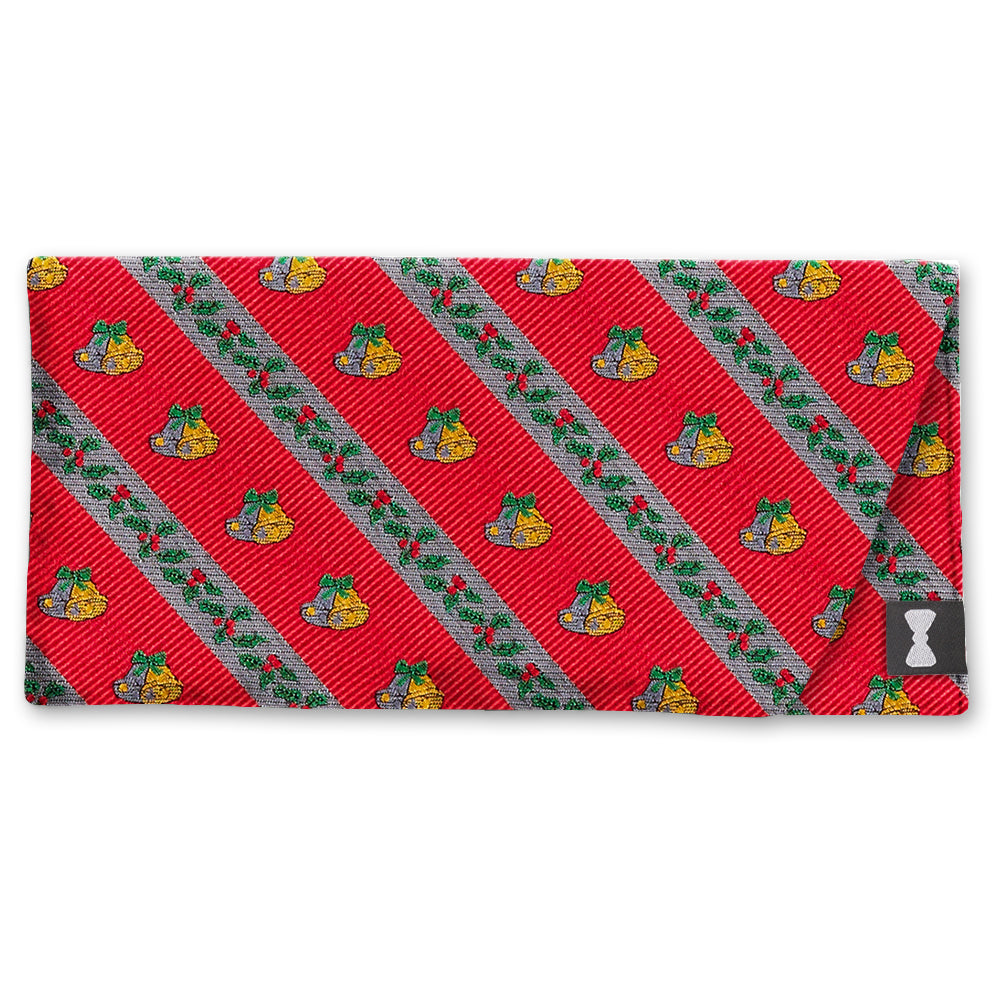 Pairs of silver and gold bells peal out good cheer in broad swaths of textured red woven silk interspersed with boughs of holly in silver-grey ribbons.