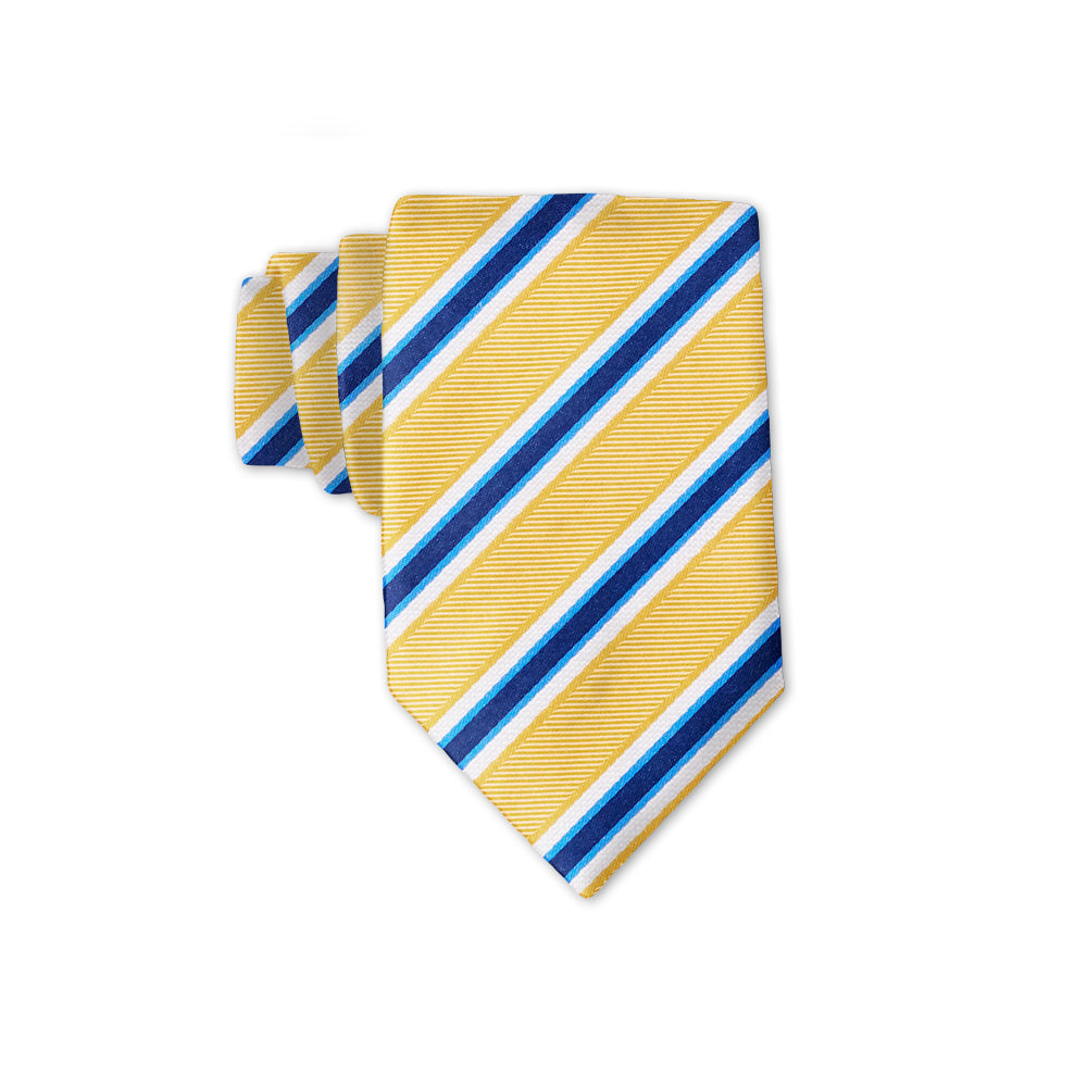 Trios of navy blue and white stripes border broad bands of yellow woven silk in this handsome stripe.