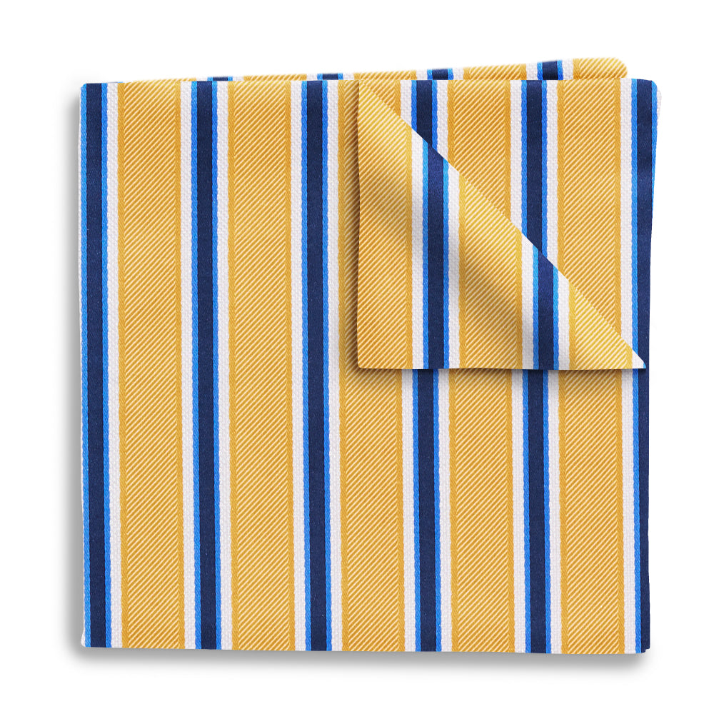 Trios of navy blue and white stripes border broad bands of yellow woven silk in this handsome stripe.