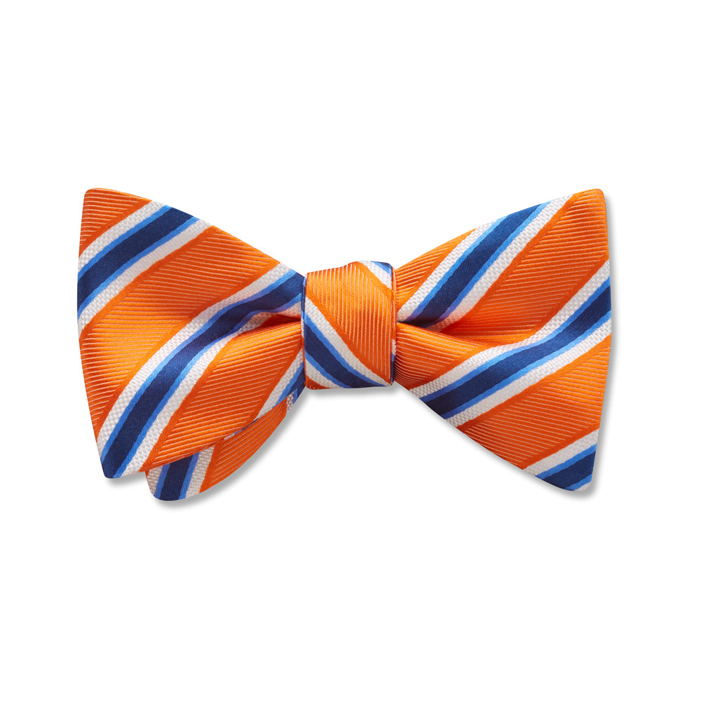 White-bordered ribbons of navy blue are interspersed between bands of warm orange in this appealing woven silk stripe.