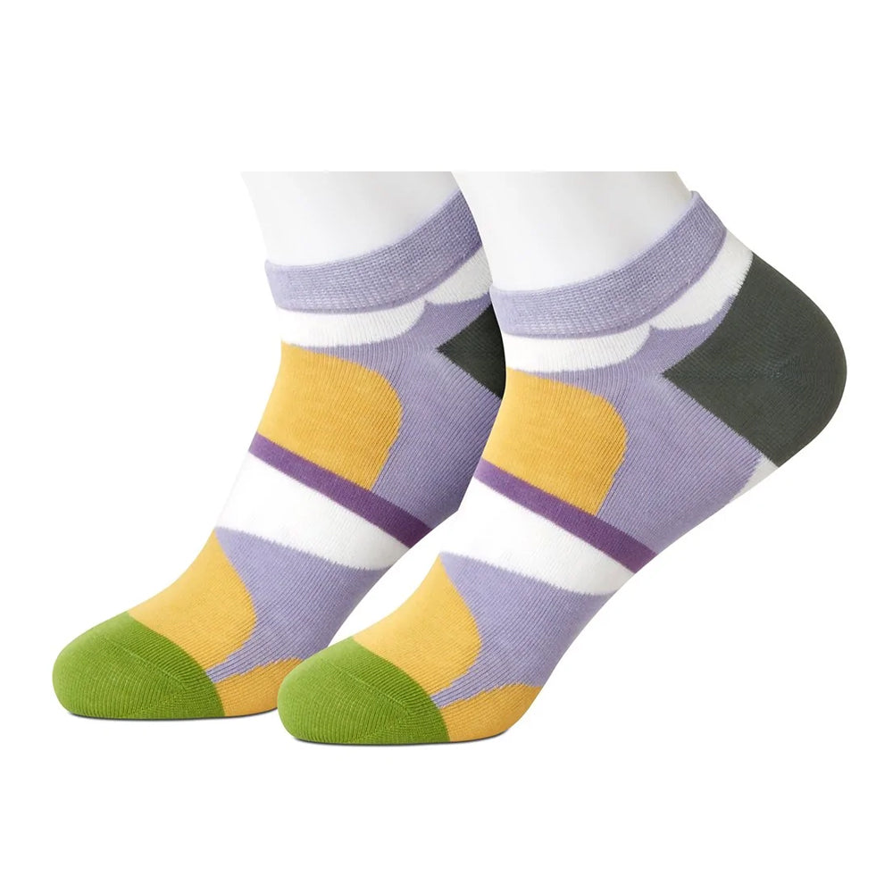 White ankle socks with artful abstract shapes in shades of lilac, gold, green and saffron.