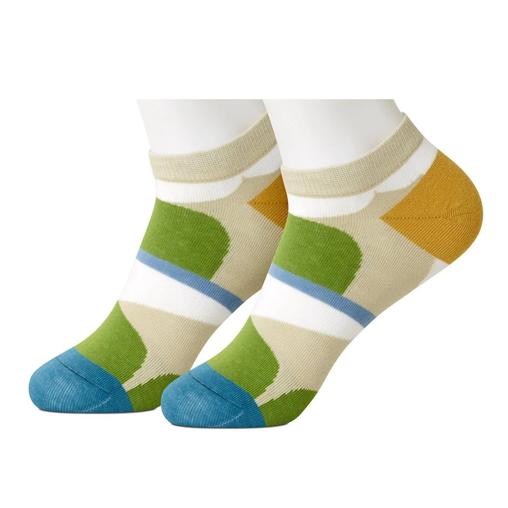 White ankle socks with artful abstract shapes in shades of sand, blue, gold and sage.