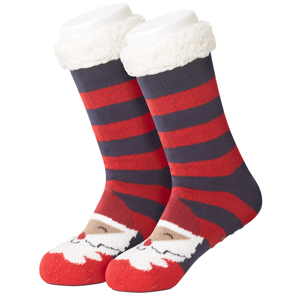 You'll want to show off these red and blue striped non-skid slipper socks with their snuggly fleece lining and fuzzy fleece tops, leading down to Jolly Ol' Saint Nick smiling on the top of your toes.