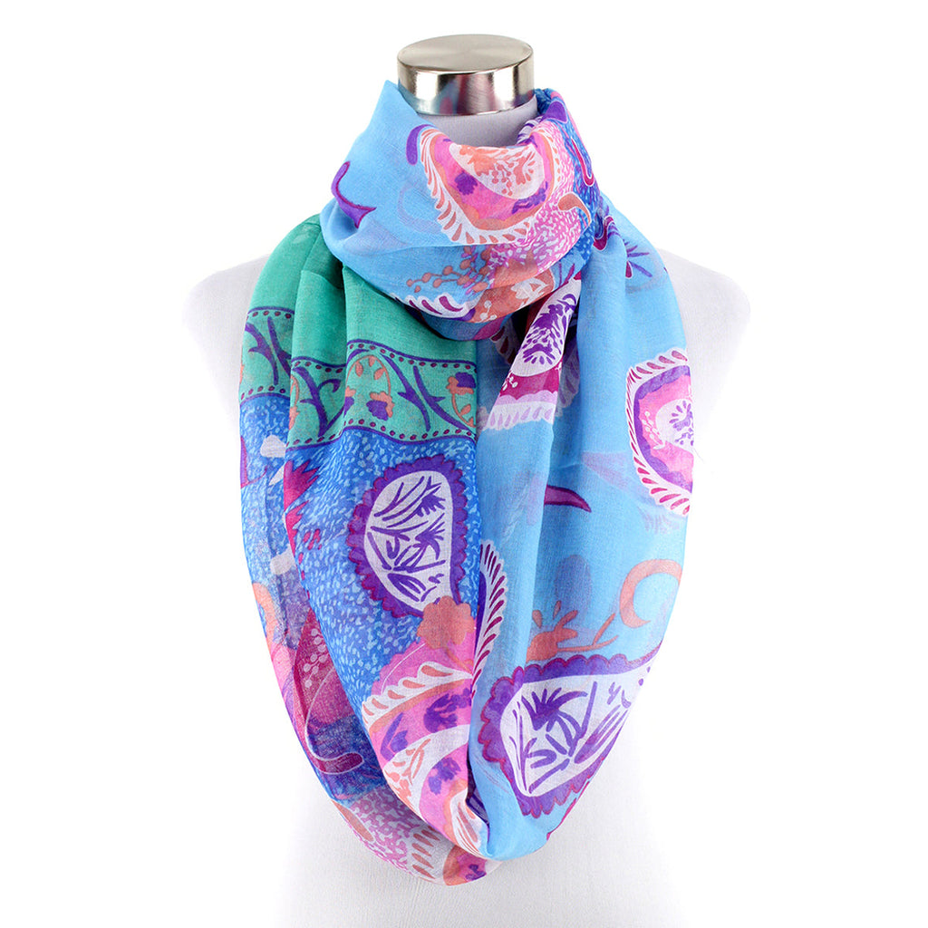 A combination of patterns in shades of purple, pink and coral swirl together on a blue background in this glorious infinity scarf's design - bordered in jade green.