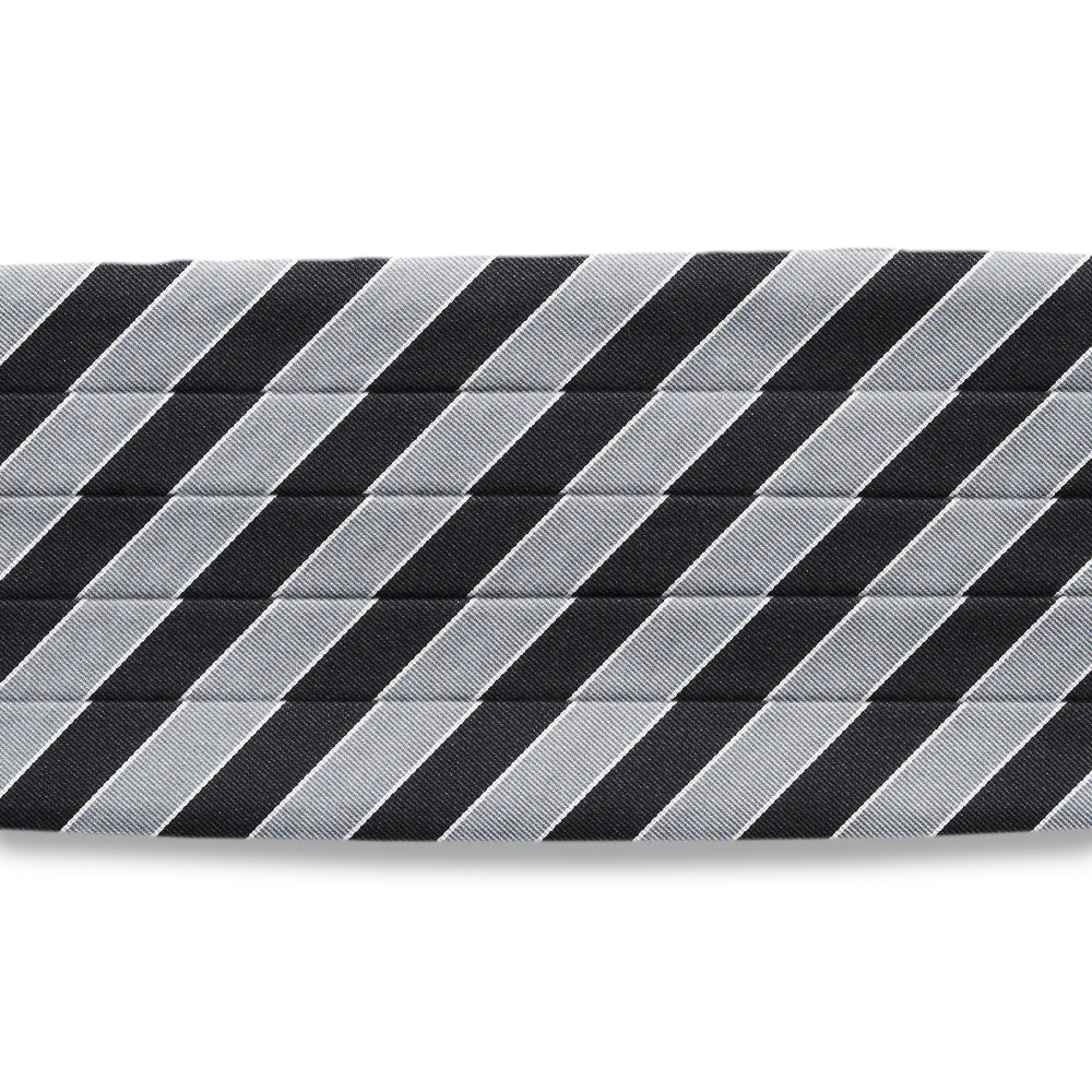 Woven in a beautifully textured silk, black and silver stripes are separated by slim bands of white culminating in a formal choice that is as simple as it is striking. A great choice for a cummerbund, too.