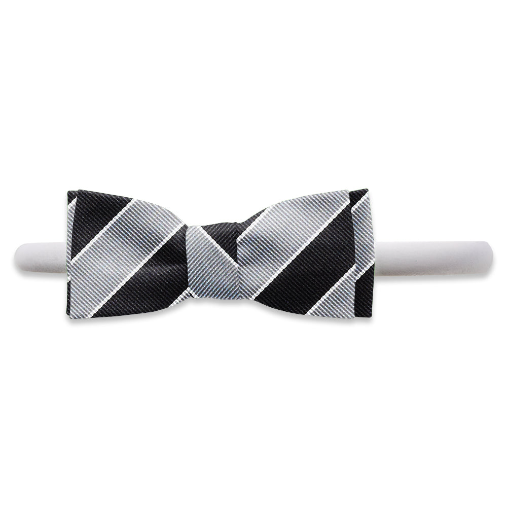 Woven in a beautifully textured silk, black and silver stripes are separated by slim bands of white culminating in a formal choice that is as simple as it is striking. A great choice for a cummerbund, too.