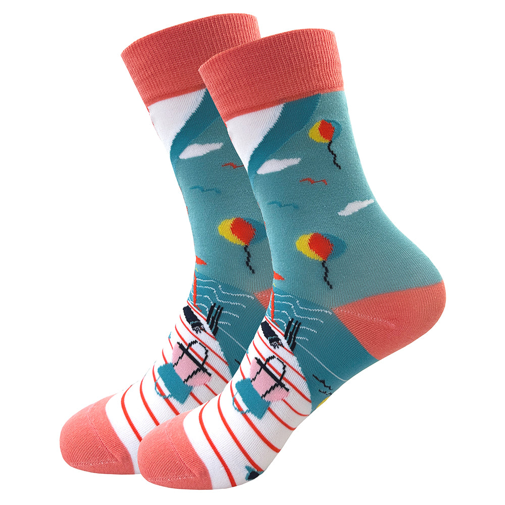 Treat your feet to a day at the beach wearing these whimsical socks and their seaside iconography - from beachbags to balloons - in shades of orange, blue and white.