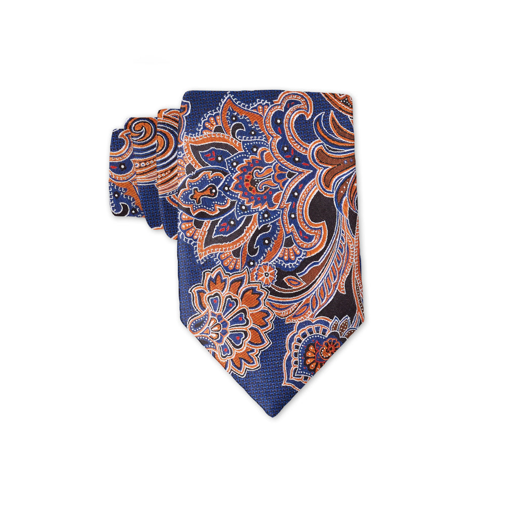 Grand floral motifs (with hints of paisleys, too) in combinatons of blue, orange, red, white, brown and black whirl and swirl in handsome navy blue woven silk, and are sure to add some flair to your outfit.