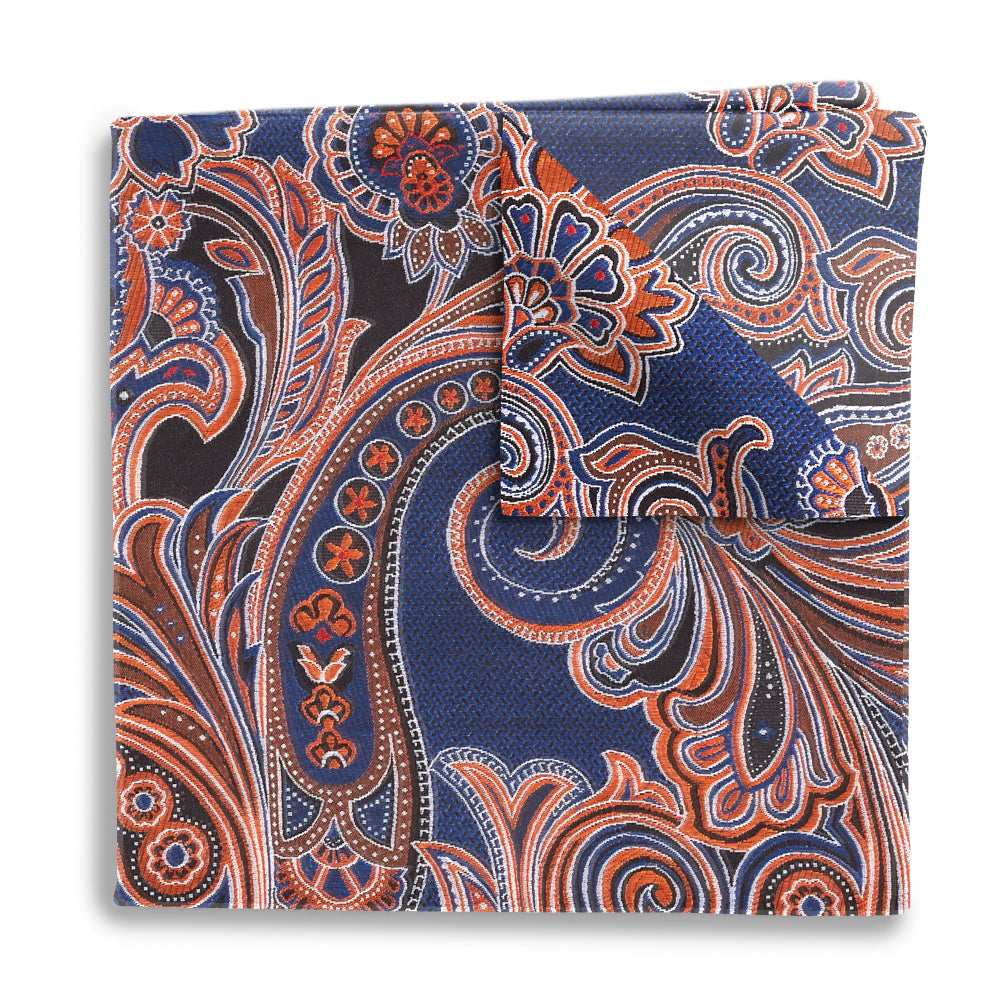 Grand floral motifs (with hints of paisleys, too) in combinatons of blue, orange, red, white, brown and black whirl and swirl in handsome navy blue woven silk, and are sure to add some flair to your outfit.