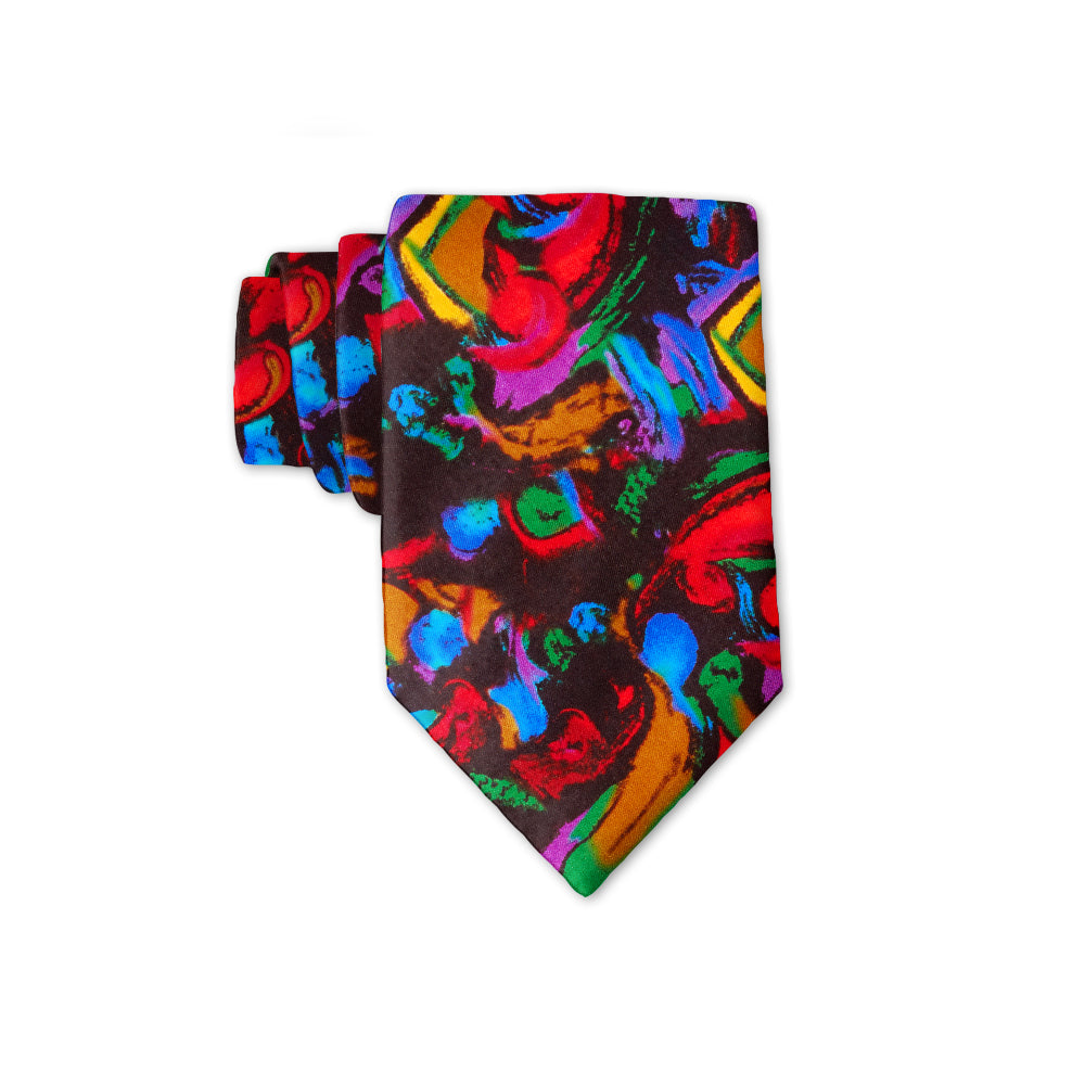 Practically irresistable, this black silk twill is covered with abstract splatters of blue, orange, gold, purple, red and green.