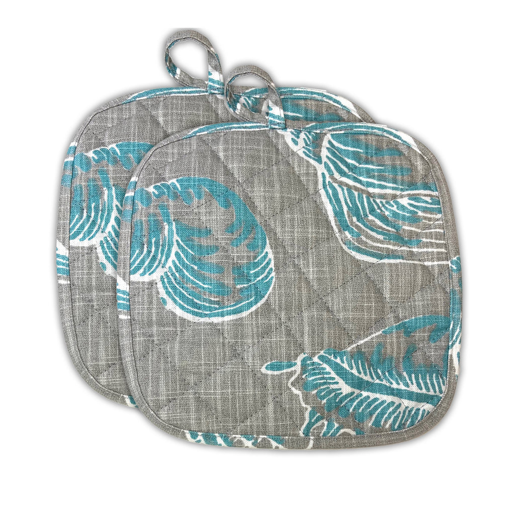 Silvery grey covered with a collection of big blue shells. No two potholders will be exactly the same.