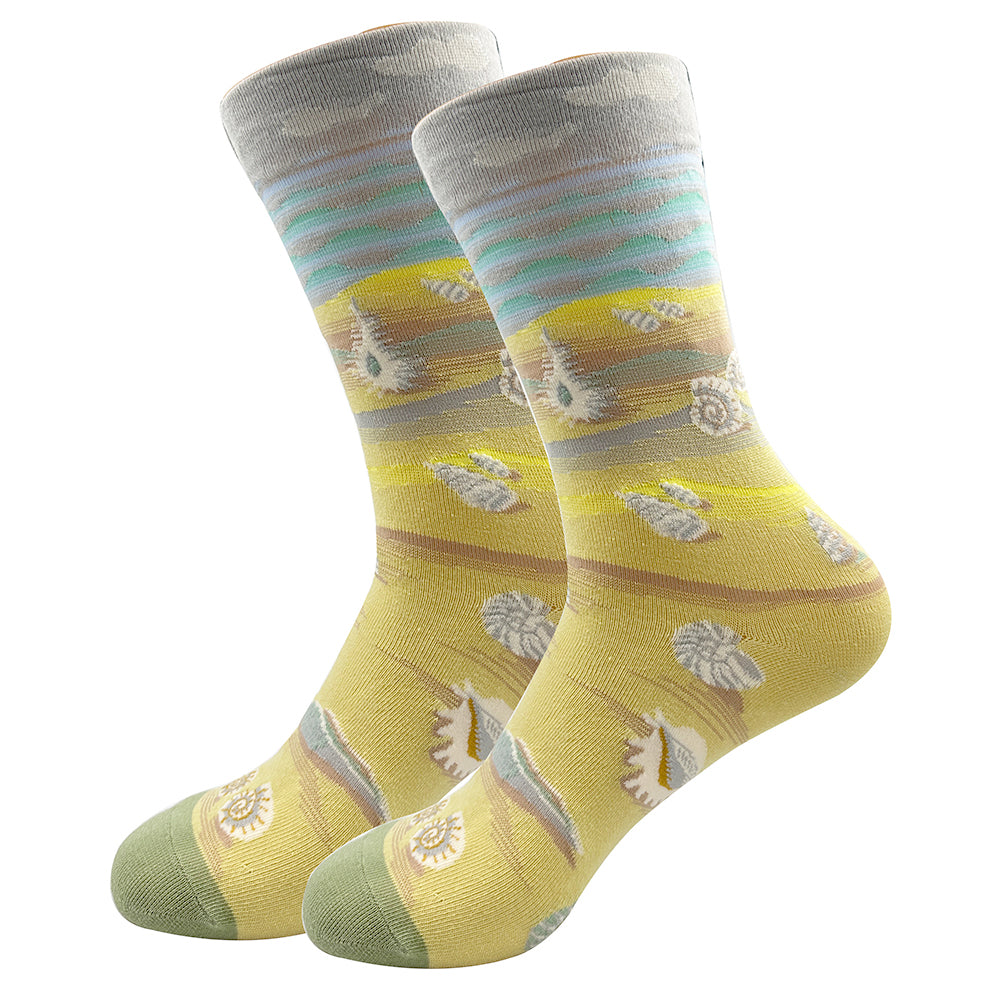 Treat your inner beachcomber to these appealing crew socks featuring a plethora of shells on misty morning shades of gold with hints of brown, foggy grey and blue.