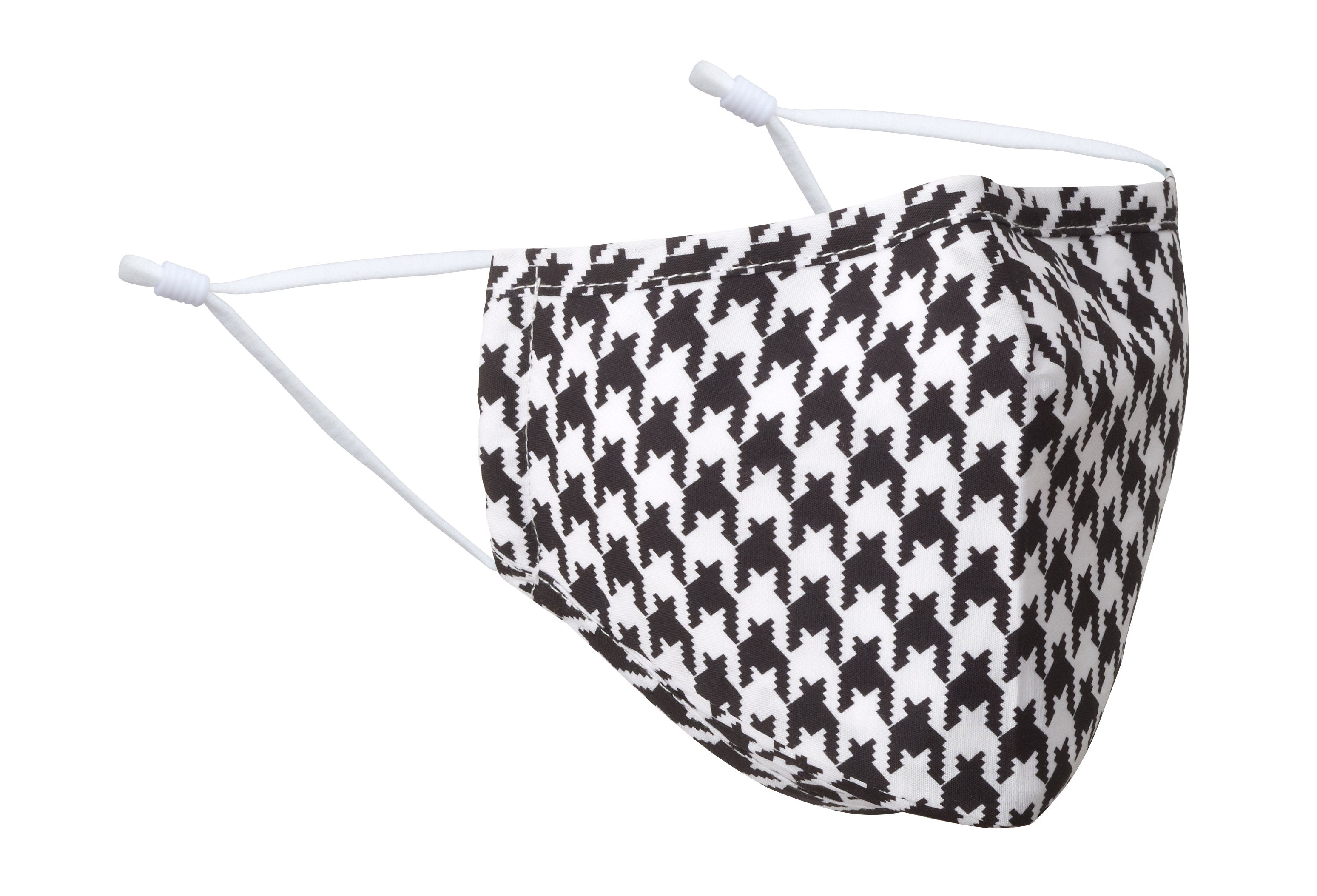 Take your style to a great place when you don this black and white houndstooth pattern on an all cotton, tripe-layer face mask.