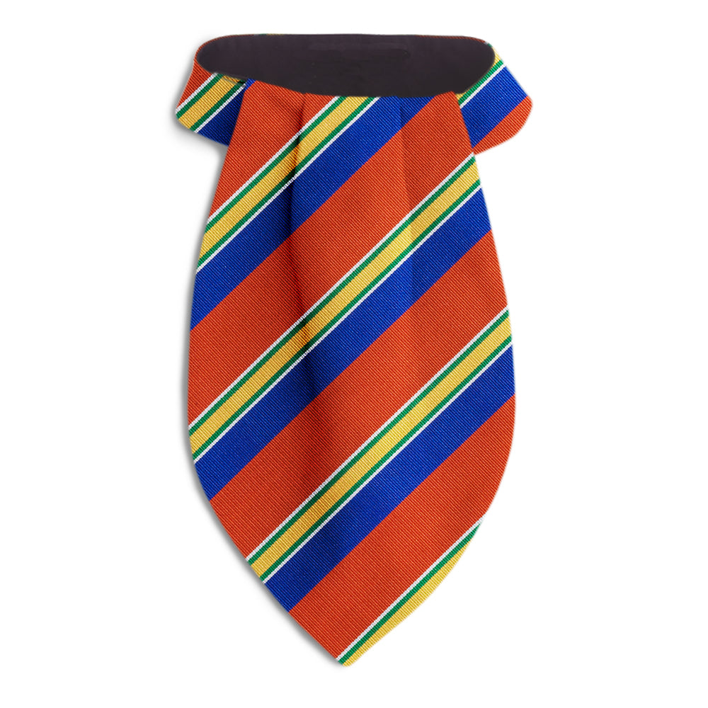 A strikingly handsome woven silk featuring lightly ribbed bands of burnt orange and blue interspersed with quintets of gold, green and white. A go-to choice for almost any occasion.
