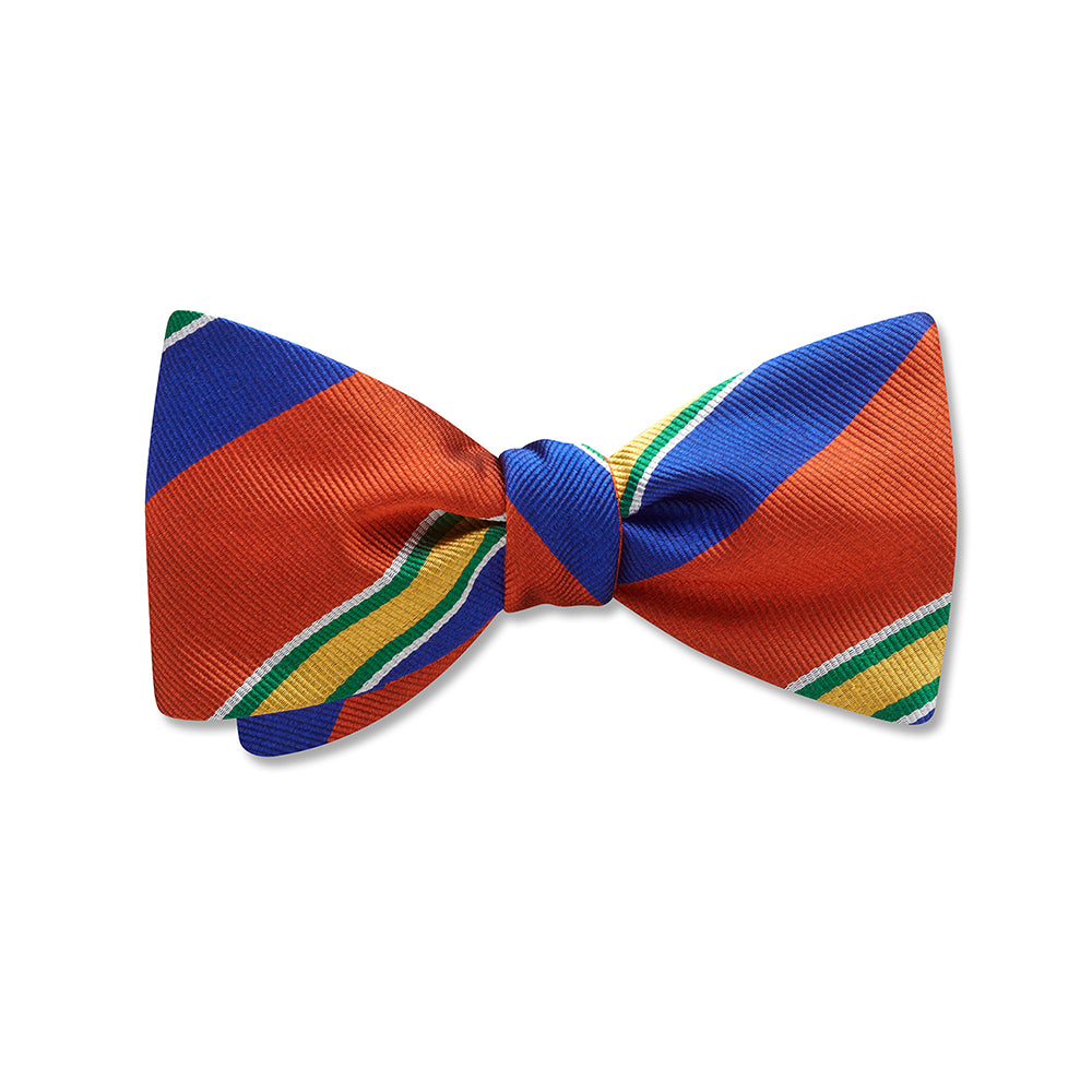 A strikingly handsome woven silk featuring lightly ribbed bands of burnt orange and blue interspersed with quintets of gold, green and white. A go-to choice for almost any occasion.