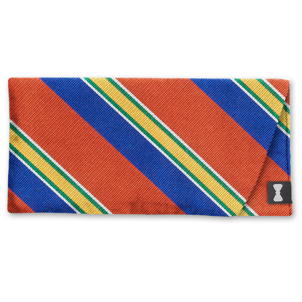 A strikingly handsome woven silk featuring lightly ribbed bands of burnt orange and blue interspersed with quintets of gold, green and white. A go-to choice for almost any occasion.