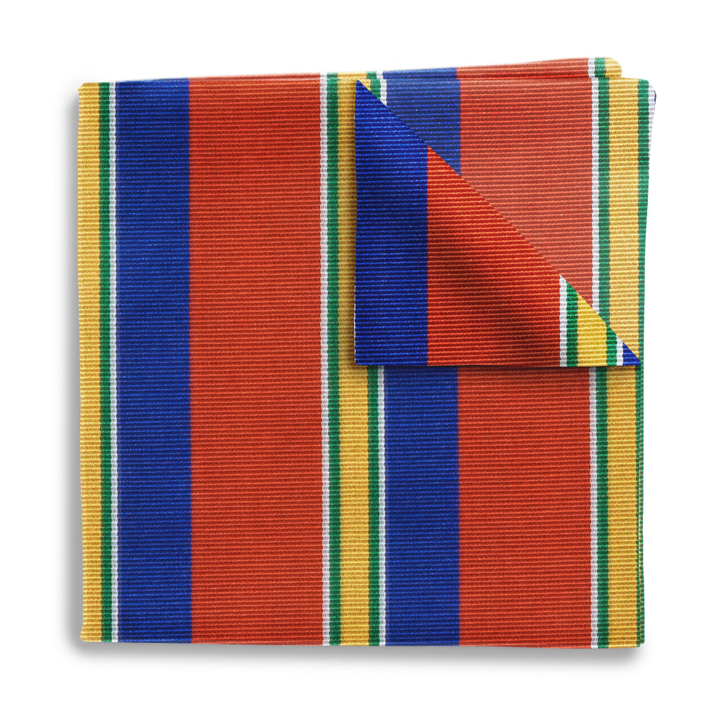 A strikingly handsome woven silk featuring lightly ribbed bands of burnt orange and blue interspersed with quintets of gold, green and white. A go-to choice for almost any occasion.
