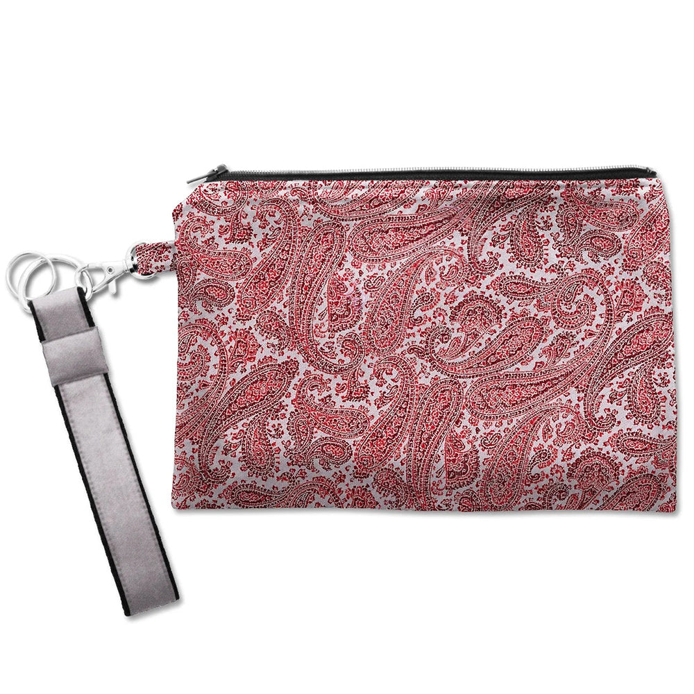 Make any occasion special when you cary this wristlet dancing with dark red paisleys in silvery grey woven silk on the outside, with a contrasting strap and interior lining of solid grey woven silk.