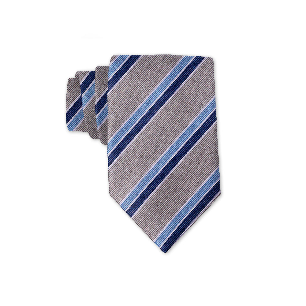An extraordinarily handsome stripe, this woven silk with its ribbed texture features broad bands of silver grey running between quintets of white, navy and slate blue.