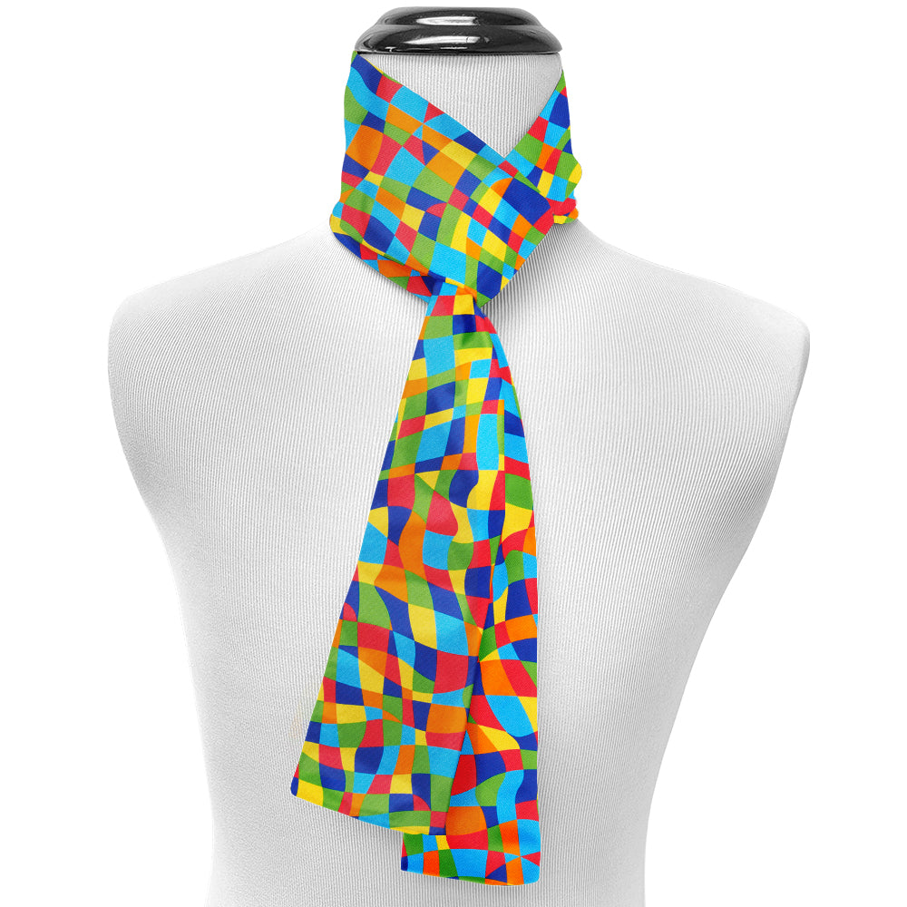 Abstract quadrangles (well, mostly) of navy blue, lime green, orange, sunny yellow, red and sky blue dance together with abondon on this beautiful silk twill design.