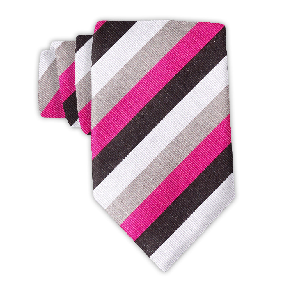 This stunning stripe features lightly ribbed strokes of black, pink, grey and silver woven silk. An impressive choice for nearly any occasion.