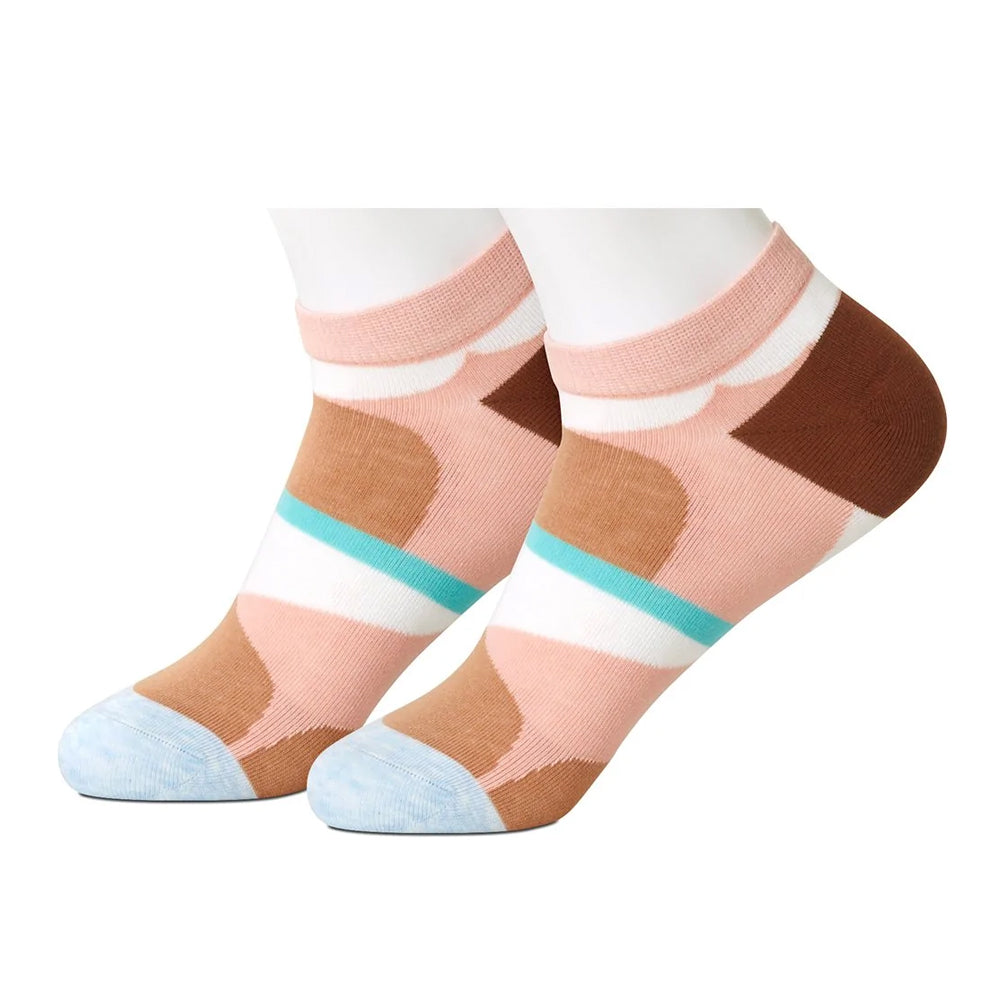 White ankle socks with artful abstract shapes in shades of brown, rose, copper and slate blue.