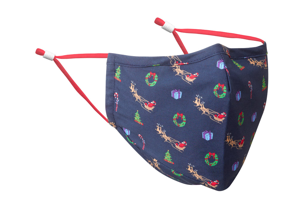 Santa is in his sleigh, racing through a midnight blue cotton sky that is dancing with happy holiday icons on this totally fun face mask.