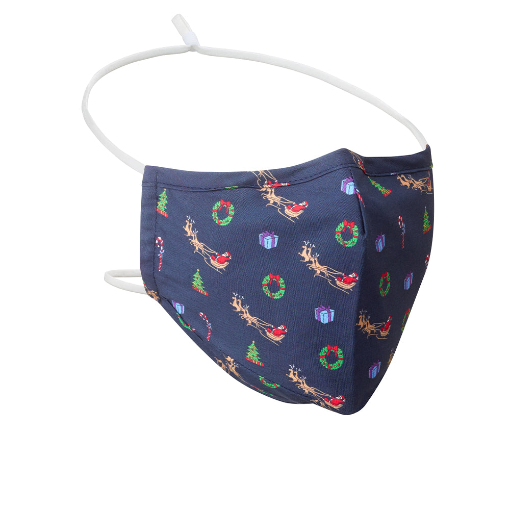 Santa is in his sleigh, racing through a midnight blue cotton sky that is dancing with happy holiday icons on this totally fun face mask.