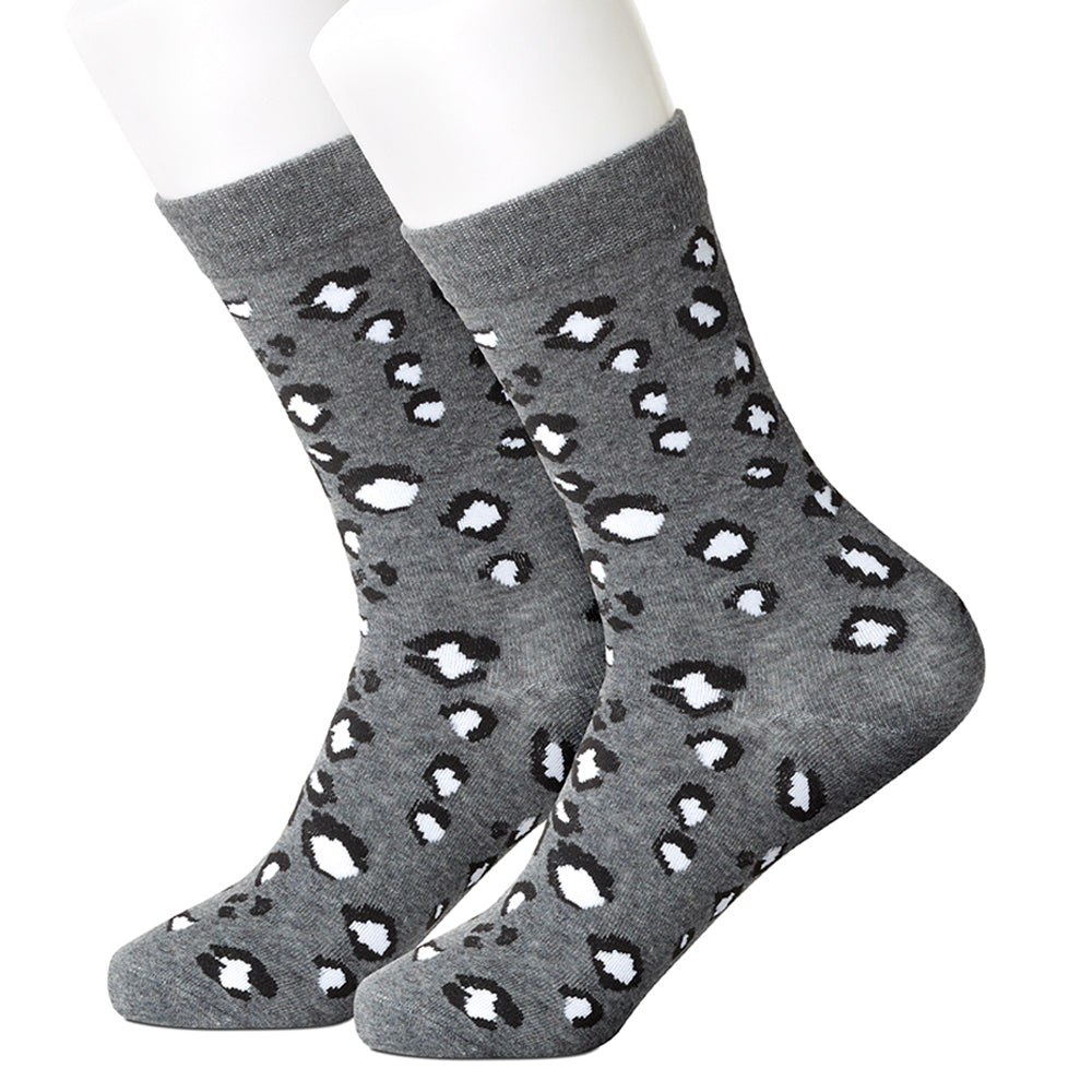 Wander on the wild side wearing these grey socks with their abstract pattern of black and white spots.