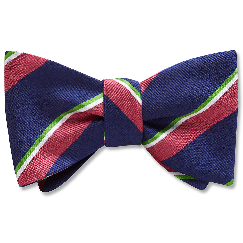 A unique combination of broad swaths of navy blue, bands of dusky red and slim ribbons of bright green and white woven silk make this stripe a true standout.