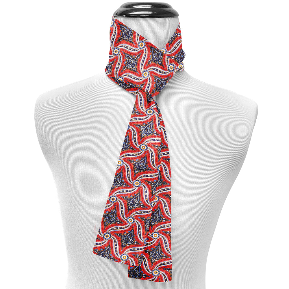 Bright red silk practically pulses with energy in this design of blue and gold medallions spinning between floral-centered pinwheels in the same hues. A vibrant addition to your wardrobe.