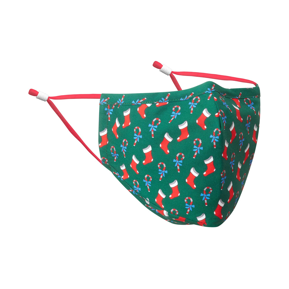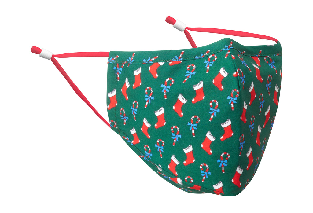 Dark green cotton with cheerful images of beribboned candy canes and Christmas socks. A happy face mask for the holidays.