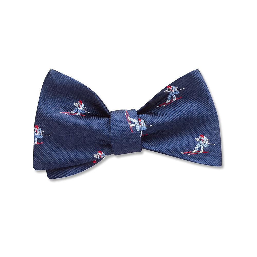 Celebrate the joy of winter on the mountain when you wear this midnight blue silk with a plethora of skiers - all in a racing tuck - woven in.