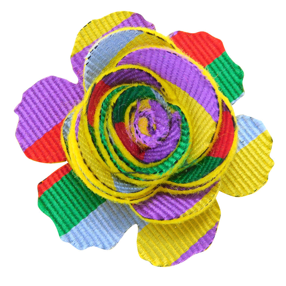 This cheerful boutonniere will not wilt or fade after you've tucked it into your lapel. Beautifully woven silk featuring stripes of green, red, light blue, gold and purple, it's backed with hand cut sunny yellow wool felt, and finished with a pin to anchor it to your jacket.