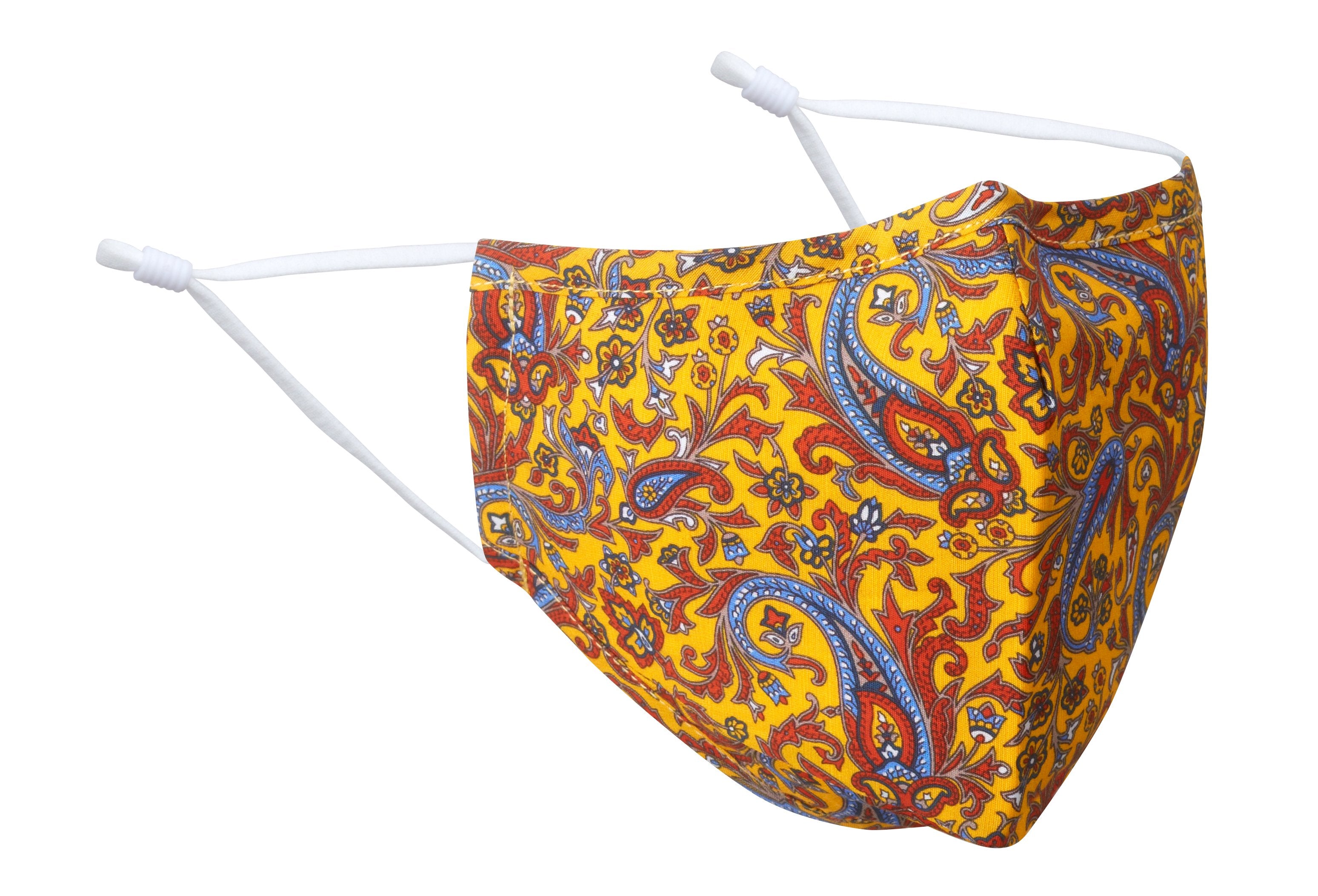 Golden yellow cotton is alive with the whirls and swirls of dark red and blue paisleys interspersed with small blooms. A charming face mask to wear just about anywhere.