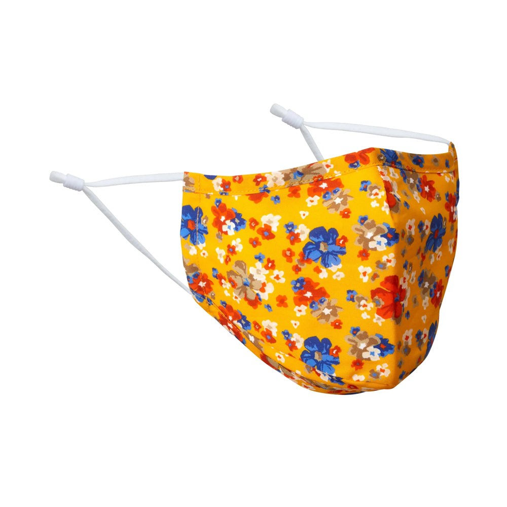 Cover up and look good in this triple-layer, all-cotton yellow face mask covered with a profusion of orange, blue and white flowers.