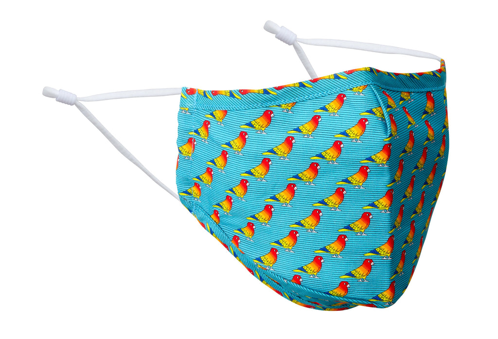 Cover up and look chirpy in this triple-layer, all-cotton face mask hosting a flock of yellow and red tropical birds on aqua blue.