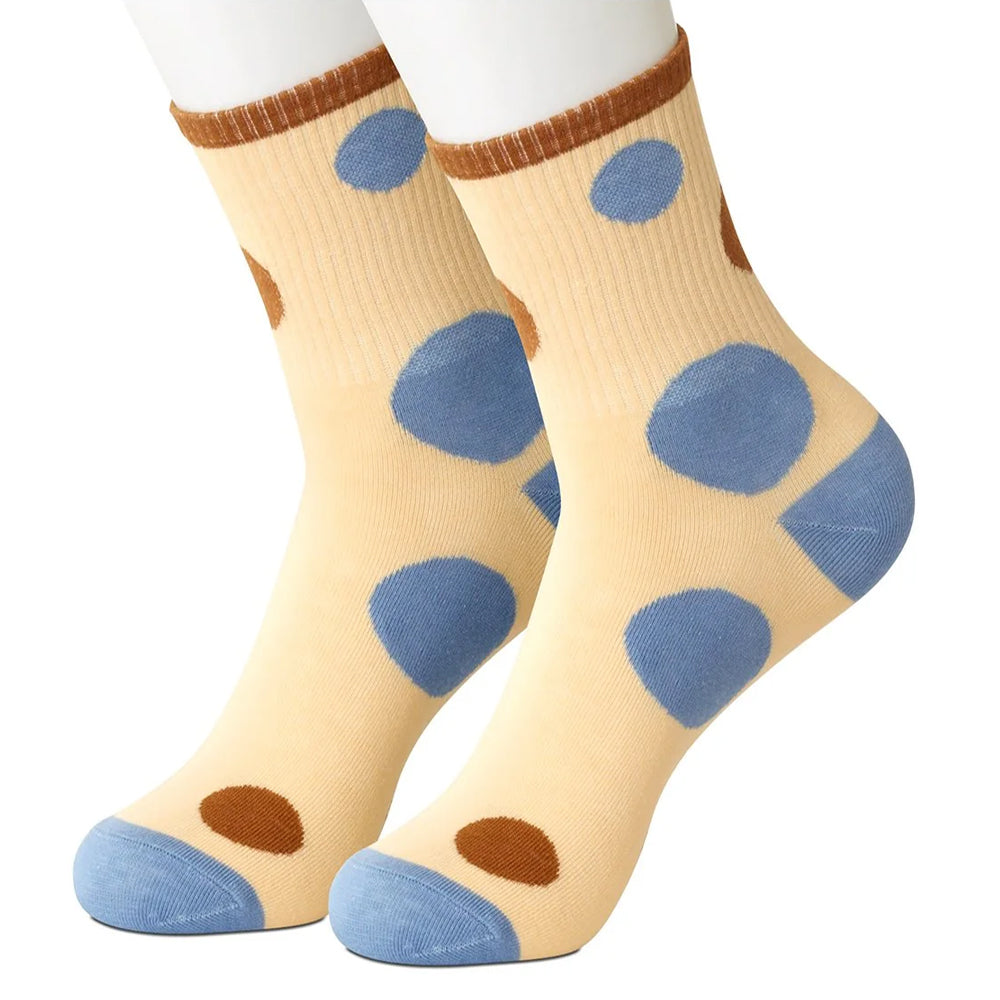 Not exactly champagne, but fun bubbles of brown and blue rise happily on these cheerful tan socks.