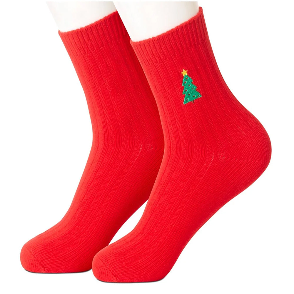 Bright red ribbed socks feature a small holiday tree topped with a gold star on the top of the outside of each one. Perfectly delightful.