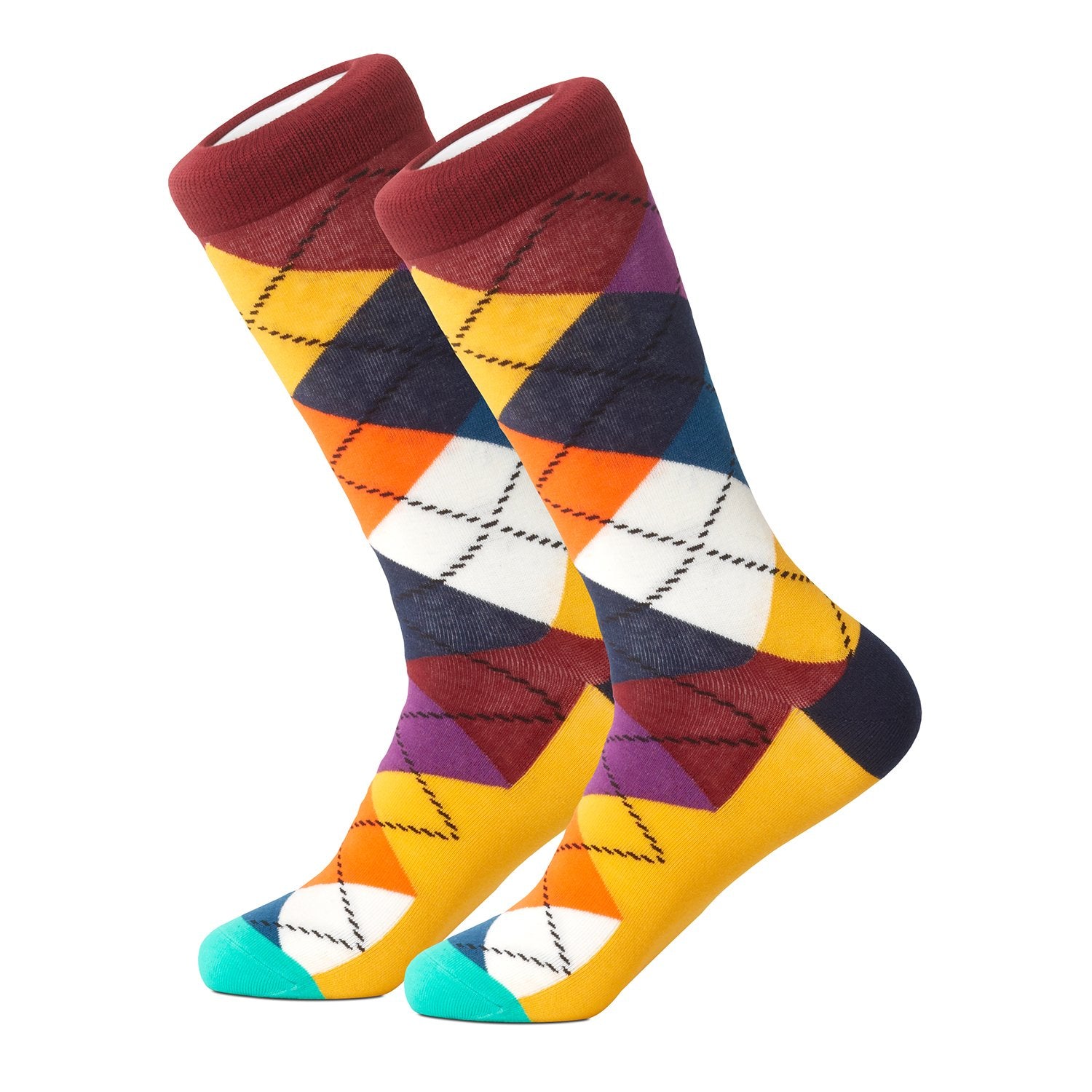 A classic argyle pattern in a wonderful combination of colors - gold, orange, wine, purple, blue, white and teal.