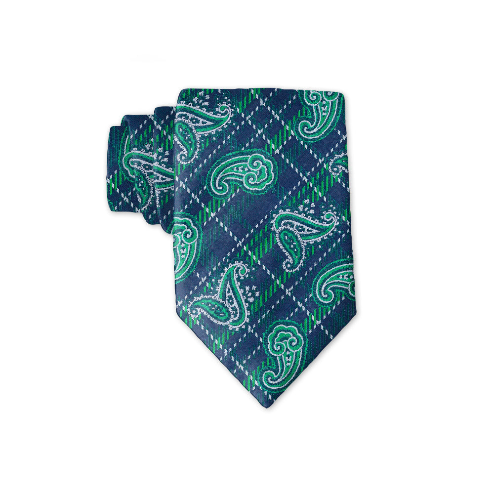 This unique design featuring a combination of a navy and green silk plaid with green with silver paisleys woven throughout is a sure-fire winner.