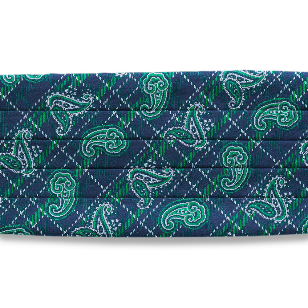 This unique design featuring a combination of a navy and green silk plaid with green with silver paisleys woven throughout is a sure-fire winner.