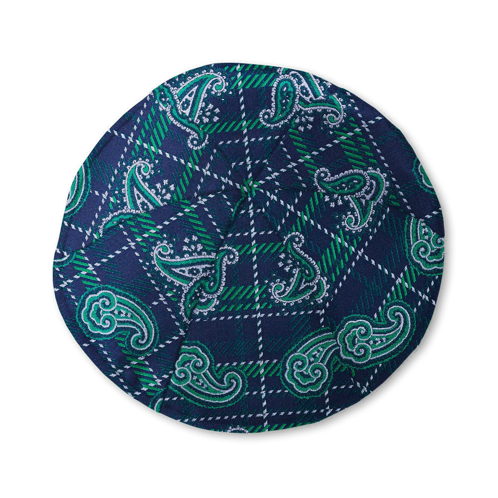 This unique design featuring a combination of a navy and green silk plaid with green with silver paisleys woven throughout is a sure-fire winner.