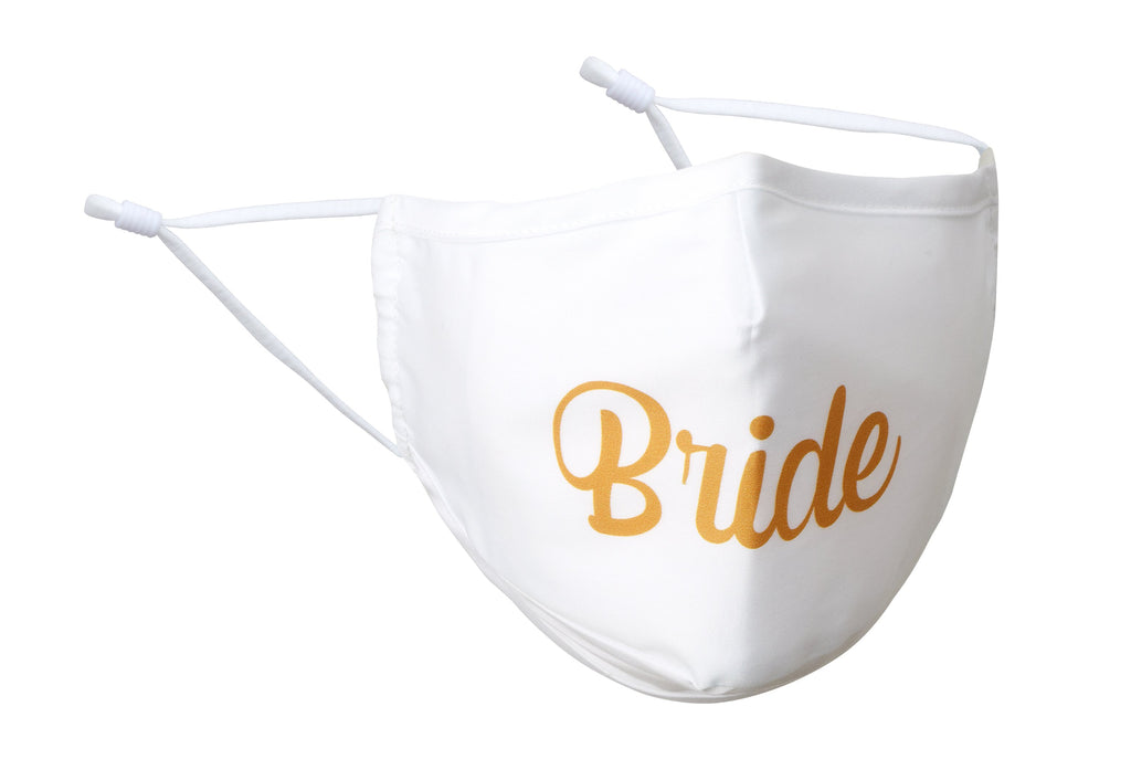 Now you'll know exactly who is who in the wedding party, even if everyone is appropriately covered up! This lovely white mask with gold lettering is the requisite "something new" for the Bride.