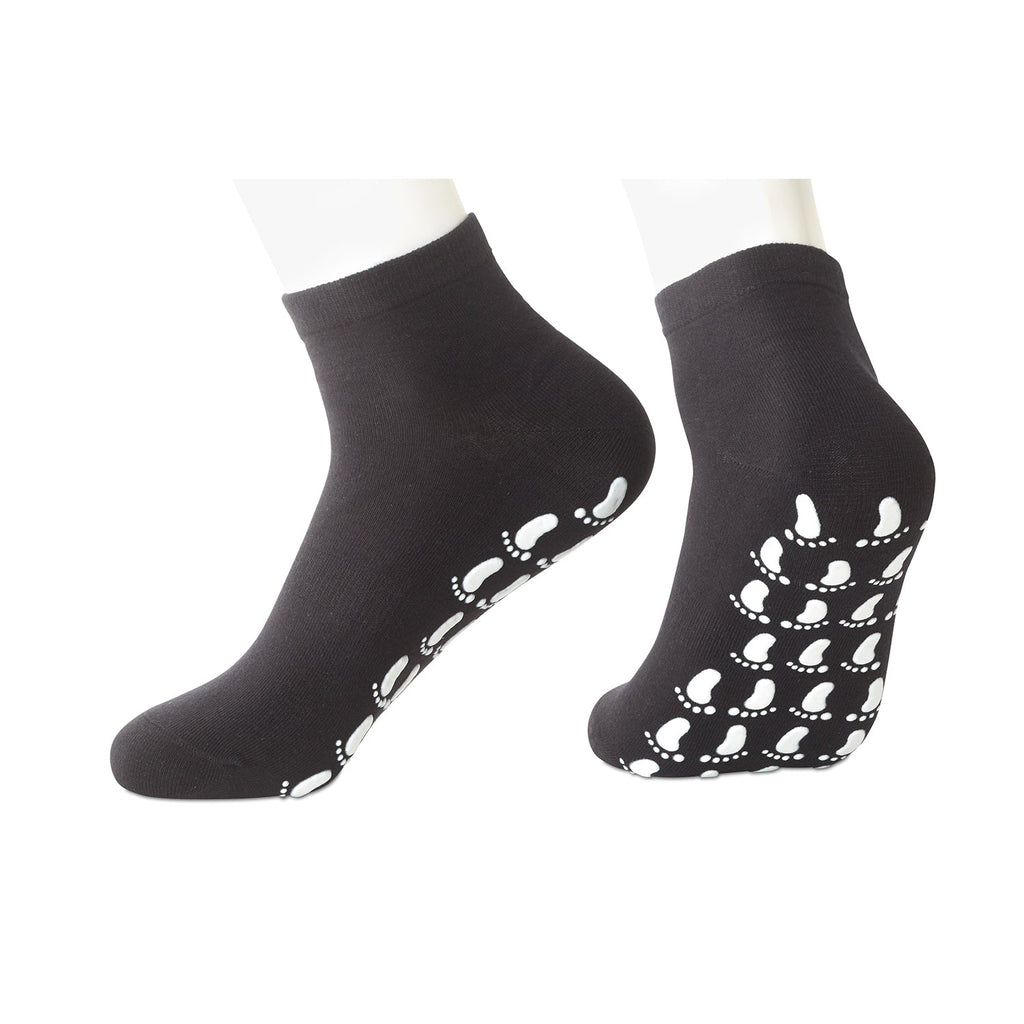 These happy (and practical) coal black ankle socks sport white foot-shaped grippers for a bit of extra security on slippery floor surfaces.